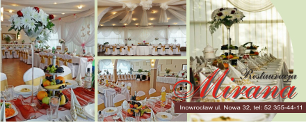 Restauracja Mirana położona niedaleko centrum w miejscowości Inowrocław słynącej z miejscowych uzdrowisk i lecznictwa rehabilitacyjnego, oferuje wyśmienitą tradycyjną kuchnię polską oraz szeroko pojęty wachlarz usług cateringowych. Dzięki starannie wyselekcjonowanym składnikom przygotowywane są smaczne i zdrowe dania czego dowodem są wieloletni stali klienci. Wyborne i zróżnicowane menu opracowywane jest specjalnie pod rodzaj przyjęcia i okoliczności tak aby podkreślić jego charakter i porę roku. W restauracji zorganizujesz także wiele imprez okolicznościowych jak, wesela, bale, przyjęcia, studniówki, bankiety oraz imprezy firmowe i plenerowe na terenie Inowrocławia lub najbliższych okolic regionu.