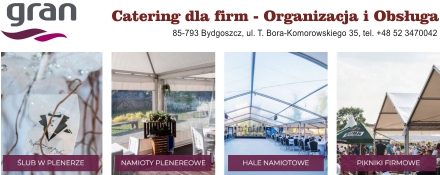 Firma Gran działa na rynku kujawsko-pomorskim od 1990 roku i zyskała już renomę niekwestionowanego lidera w swojej branży.Od lat dbamy o poziom oferowanych przez nas usług cateringu stale podwyższając ich jakość i poszerzając ich zakres. Organizuje imprezy okolicznościowe w miejscu zaproponowanym przez klienta lub w plenerze jak szkolenia, konferencje, sympozja, bankiety, koktajle, wesela, jubileusze, spotkania plenerowe, namioty, scena, pikniki, majówki, imprezy okolicznościowe rodzinne oraz firmowe.