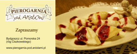 Restauracja Pierogarnia Pod Aniołami w Bydgoszczy wyznaje dewizę, że zadowolenie klientów jest najważniejsze. Maksyma „klient ma rację” jest w tym wypadku zbędna. Znakomita domowa kuchnia i sumienność w doborze surowców owocują subtelnym smakiem potraw. Znakomicie skomponowane menu, uroda i uprzejmość personelu, dowolność w doborze dodatków sprawia, że każdy z konsumentów na pewno będzie mile zaskoczony tak samo jak faktem, że może wpływać na indywidualny smak zamówionych dań. Zapraszamy do wzięcia udziału w prawdziwej uczcie kulinarnej oraz odwiedzenia naszej Pierogarni w Bydgoszczy przy zbiegu ulic Pomorskiej oraz Cieszkowskiego